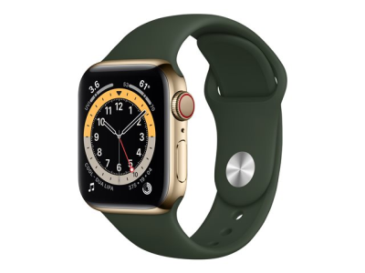 Apple Watch Series 6 (GPS + Cellular) - 40 mm - acier inoxydable doré - montre intelligente avec bande sport - fluoroélastomère - vert chypre - taille du bracelet : S/M/L - 32 Go - Wi-Fi, Bluetooth - 4G - 39.7 g